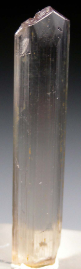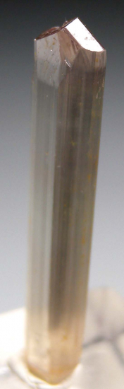 Well terminated, untwinned single Diaspore crystal. Transparent with a golden body color, vertical striations and flat, lustrous termination faces. Transparent gem quality top to bottom! Complete all around and in excellent condition. Note that Diaspore is dichroic, changing between golden and purple tones in different lighting. This crystal appears more golden colored to my eyes, but the camera is picking up some of the purple tones. |